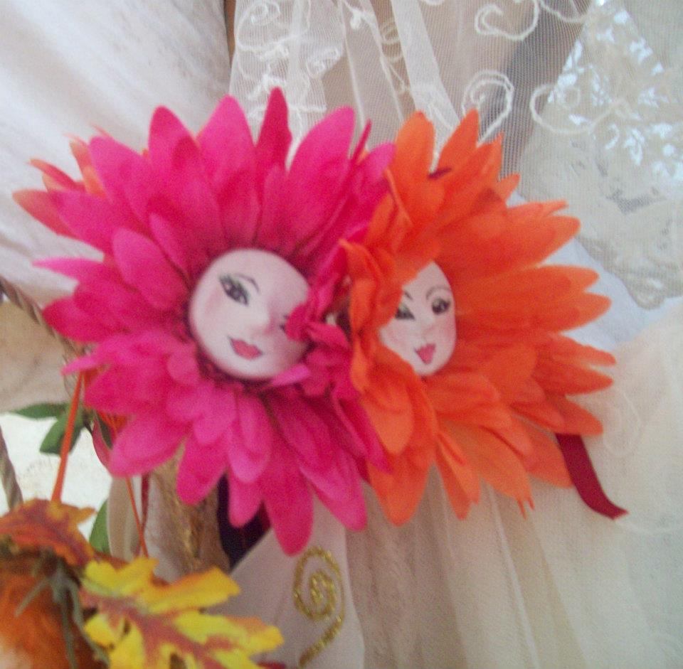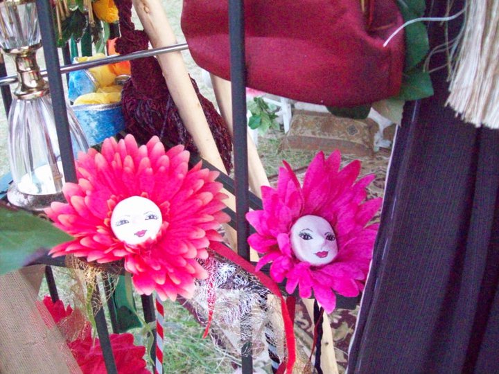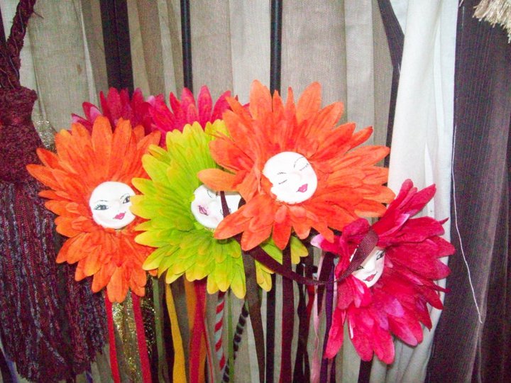 Alice's talking flower wands. Approx 24" tall, each one has a hand sculpted, hand painted face and each are one of a kind!