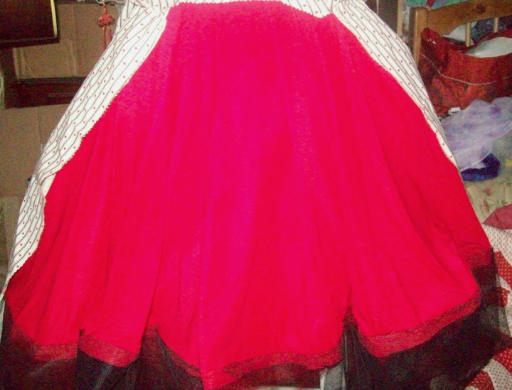Includes red dress and striped overdress. Skirt has black tulle edging at hem.