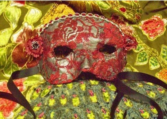 Red Queen Masquerade Mask, custom to order ( I can also make this in other colors.) Red lace overlay, silk flowers and satin ribbon ties.