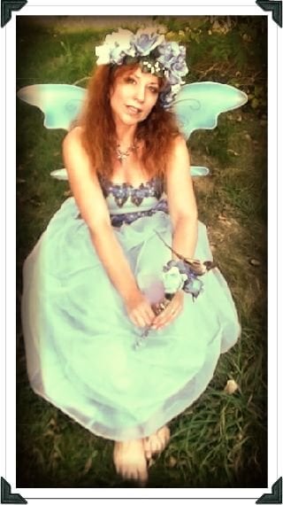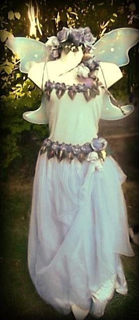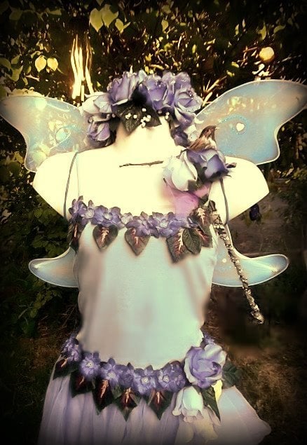 Blue Fairy Costume. Taffeta and chiffon skirt with tulle underskirt, embellished with silk flowers and leaves. More flowers and leaves adorn the stretch knit cotton top, wings, headdress and wand (the wand has a little birdie sitting on top too! :)