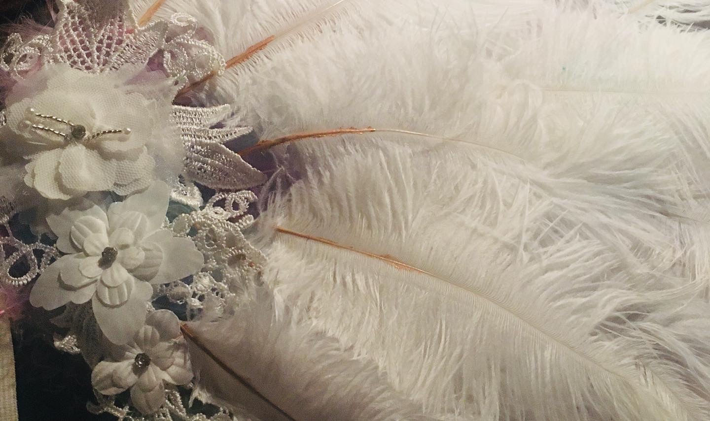 Created with 200 individually applied feathers, including 100 ostrich feathers & lace and rhinestone accents.