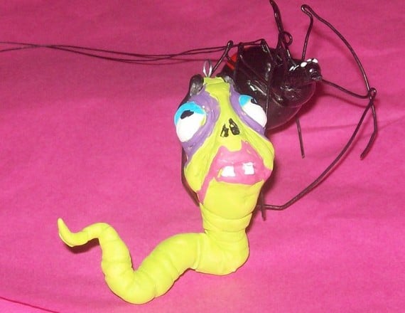 Hand-sculpted and hand painted earrings.The spider earring I've made to hang longer, so it's 'sitting' on your shoulder. The maggot will be a shorter earring, up by you ear and peeking out of your hair :)