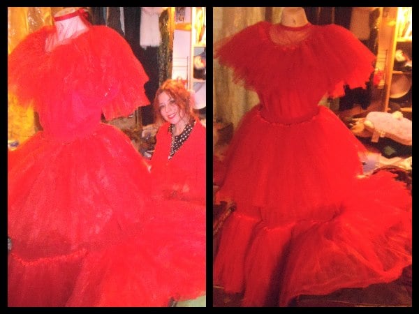 Handcrafted costume gown embellished with layers and layers of frothy red tulle! Includes bouquet and veil.