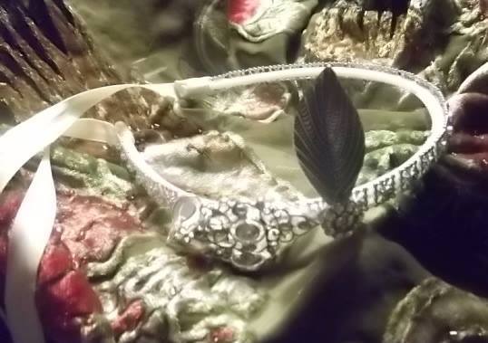 Headband is handcrafted from vintage jewelry findings and ties with a cream satin ribbon.