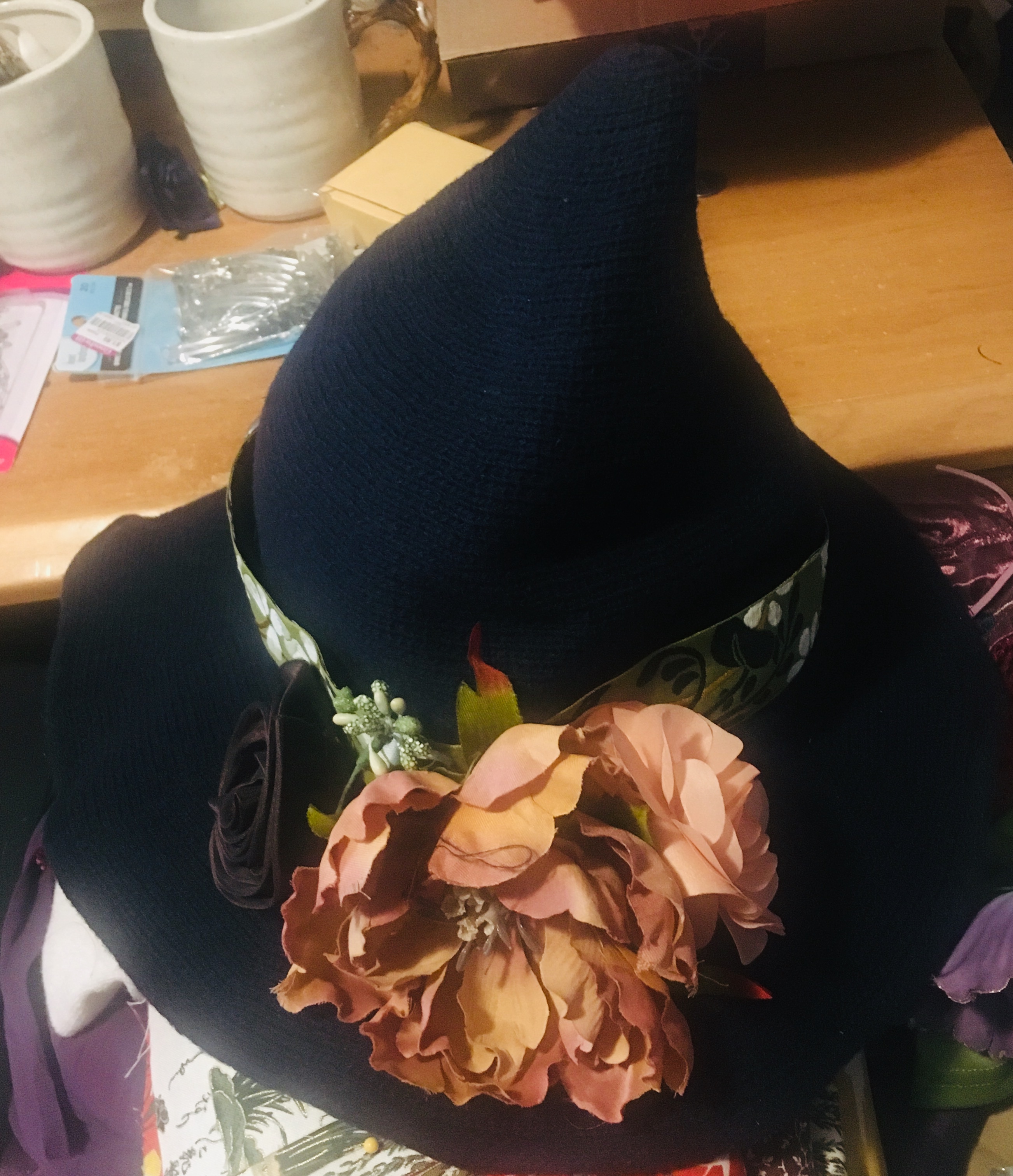 our witch hat is embellished with silk flowers and vintage lace and trim. Each is created to order & one of a kind, so please specify preferred colors when ordering :). Thank you for looking!